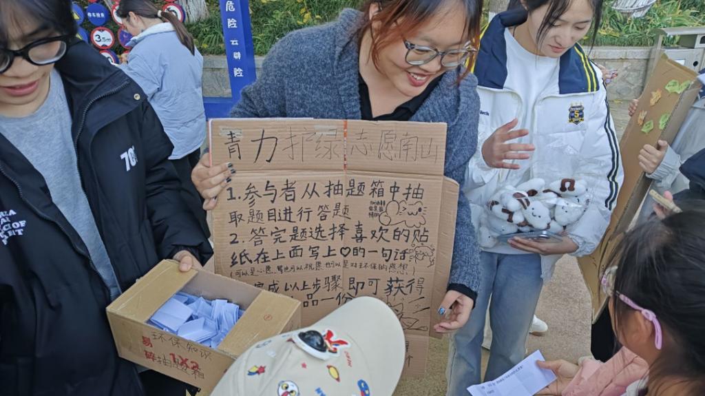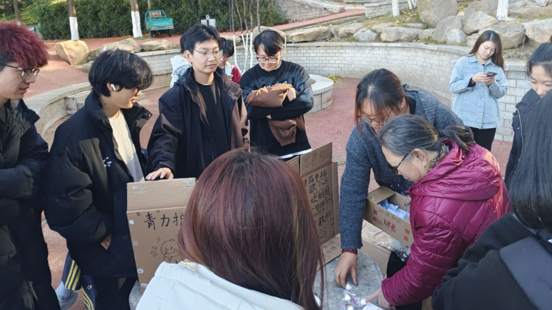 11月9日,应241-4、应241-5团支部将环保课堂“搬”至烟台南山公园,开展了以“‘青’力护绿,志愿南山”为主题的志愿服务活动。他们俯身清理草丛残屑、拭去长椅积尘,让公园角落重归洁净清朗;手绘的宣传海报鲜活醒目,纸板搭起的互动区更聚满人气——抽题箱里藏着“绿色化学”趣味知识,答题后的市民将环保心愿写在便签上,一句句质朴期许,把善意揉进了游园的烟火里。恰逢周末的南山公园人流熙攘,也让这份青春环保的心意,随秋风传向了更多角落。